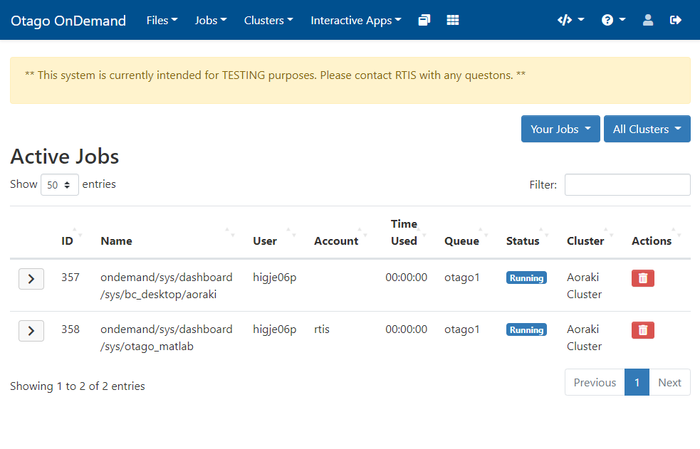 View and cancel active Slurm jobs from Jobs > Active Jobs. This includes jobs started via sbatch and srun as well as jobs started (implicitly) via Open OnDemand (as discussed above).